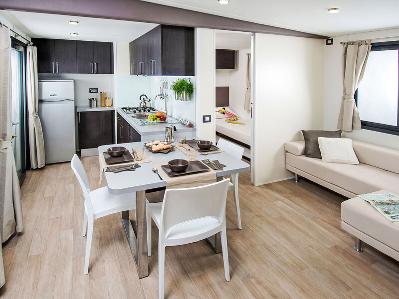 3-kamers mobilhome 30 m2. Doelmatig en modern ingericht: kleine woon-/eetkamer met kookhoek en TV. 1 kleine 2-pers. kamer. 1 kleine kamer met 2 bedden. Douche/bidet/WC. Elektrische verwarming (extra), air-conditioning (extra). Terras 15 m2. Terrasmeubelen. Ter beschikking: klamboe, haardroger. Parkeerplaats nr. 1. IT049001B1CZHIEXLM