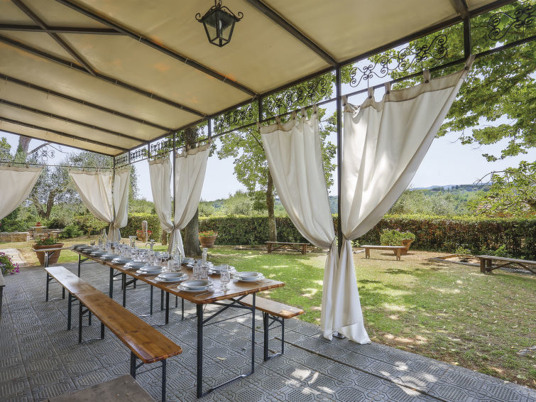 Villa 10-kamers 350 m2 op 3 verdiepingen, op de begane grond. Comfortabel en antiek ingericht: hal. Groot, open woonkamer met open haard en Sat-TV. Open eetkamer. Uitgang naar de veranda. Groot keuken (6-pits kookplaat, oven, afwasmachine, broodrooster, waterkoker, magnetron, diepvriezer). Bovenverdieping: Studio. 1 kamer met 2 bedden en douche/bidet/WC. 1 2-pers. kamer met douche/bidet/WC. 1 2-pers. kamer met bad/bidet/WC. 1 2-pers. kamer met douche/bidet/WC. 1 2-pers. kamer. 1 kinderkamer met 4 bedden. Douche/bidet/WC. 2e Verdieping: 1 2-pers. kamer. Uitgang naar het terras. Panoramazicht op het landschap. Ter beschikking: wasmachine, kinderstoel, kinderbed tot 3 jaar, haardroger. Internet (Internet (WiFi), gratis). Geschikt voor families.