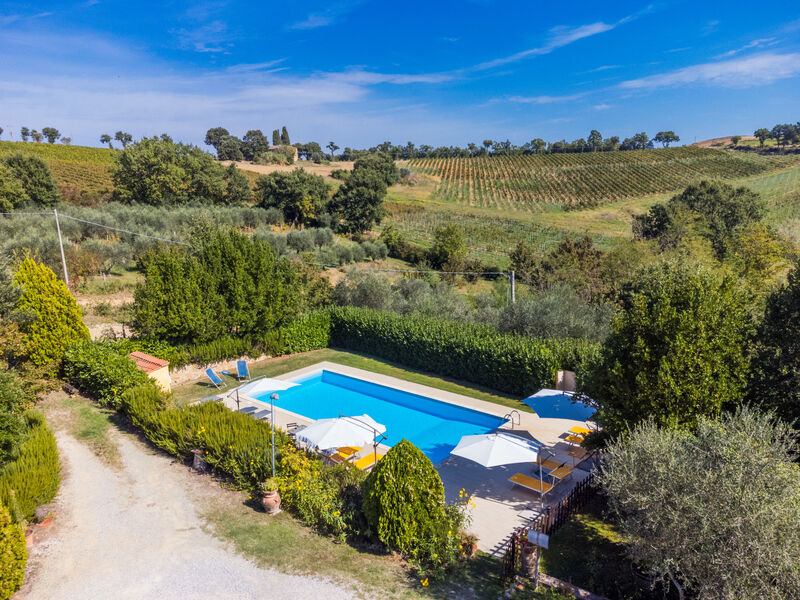 Trequanda: Kleine, gezellige, rustieke woonboerderij "Podere La Fonte", omgeven door bomen, velden en wijngaarden. 4 appartementen in de woning. 1 km van het centrum van Trequanda, 9 km van het centrum van Sinalunga, geïsoleerde, rustige ligging, 100 m van de bosrand, te midden van groen. Voor medegebruik: wild terrein 3 ha, tuin planten en bomen, boomgaard, openluchtzwembad omheind (12 x 5 m, seizoensgebonden beschikbaarheid: 15.Mei. - 15.Okt.). Buitendouche, tennisbaan, volleybalveld, patio, terras, tuinmeubelen, barbecue, onderhoud zwembad door de eigenaar/tuinman. In het huis: wasmachine (voor medegebruik, extra). 600 m lange smalle toegangsweg tot het terrein. Parkeerplaats op het terrein. Winkel 1 km, levensmiddelenwinkel 1 km, supermarkt 9 km, winkelcentrum 15 km, restaurant 1 km, bar 1 km, bakkerij 1 km, bushalte "Trequanda" 1 km, treinstation "Sinalunga" 9 km, thermaalbad "Rapolano Terme" 23 km, meer (zwemmen) "Trasimeno" 40 km. Golfterrein (9 holes) 16 km, manege 5 km. Attracties in de buurt: Pienza 17 km, Montepulciano 22 km, Cortona 35 km, Siena 55 km. Bekende meren kunnen gemakkelijk worden bereikt: Trasimeno 40 km. Auto noodzakelijk. Baby uitrusting (incl.). Lokale verkoop van streekproducten. De eigenaar woont in hetzelfde huis. Dieren in de buurt. De woningen kunnen onderling van inrichting verschillen.